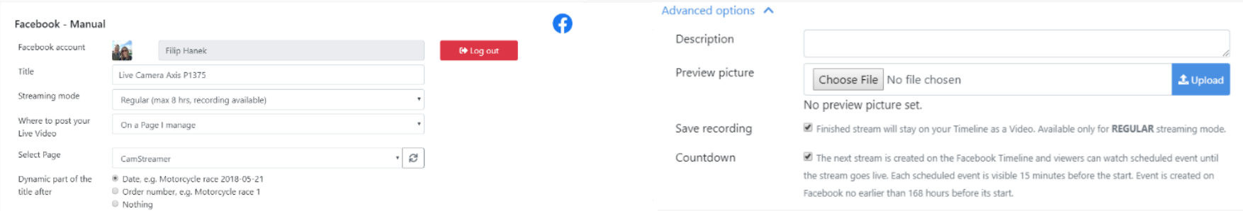 The CamStreamer App is deeply integrated with the Facebook platform and offers many options for launching your stream or displaying it on your Timeline or Facebook Page. You can even embed Facebook stream to your website.