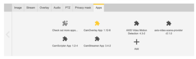 2. Sign into the camera’s web interface. In the Apps tab and simply install the CamStreamer App and CamOverlay App.