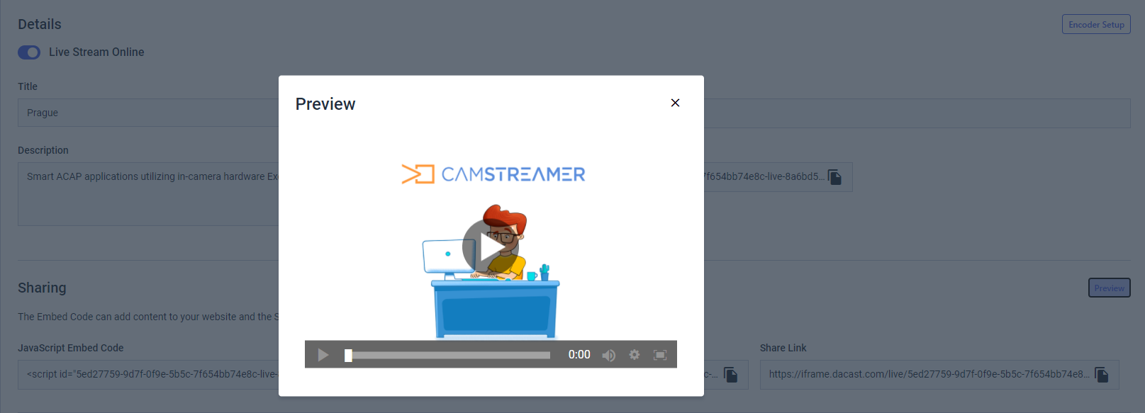 12. The live stream is now complete. According to the chosen triggering option, finish by pressing the START button on Dacast platform. In the SHARING section in the top right corner, it is possible to display the preview by pressing the PREVIEW button.