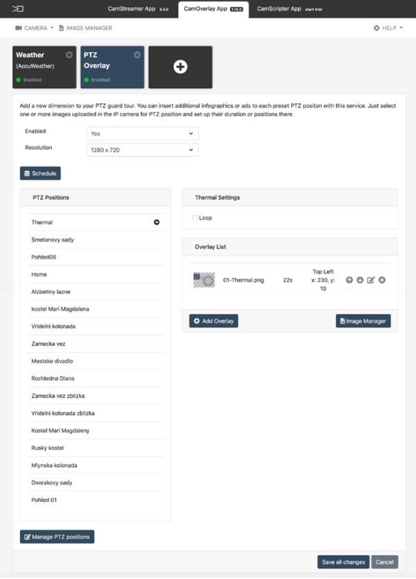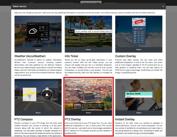 7. In the CamOverlay App, select the preset PTZ Overlay service. This is the service that makes it possible to depict various overlay graphics for each PTZ position. When the camera reaches a certain position, the prepared overlay graphic will appear.